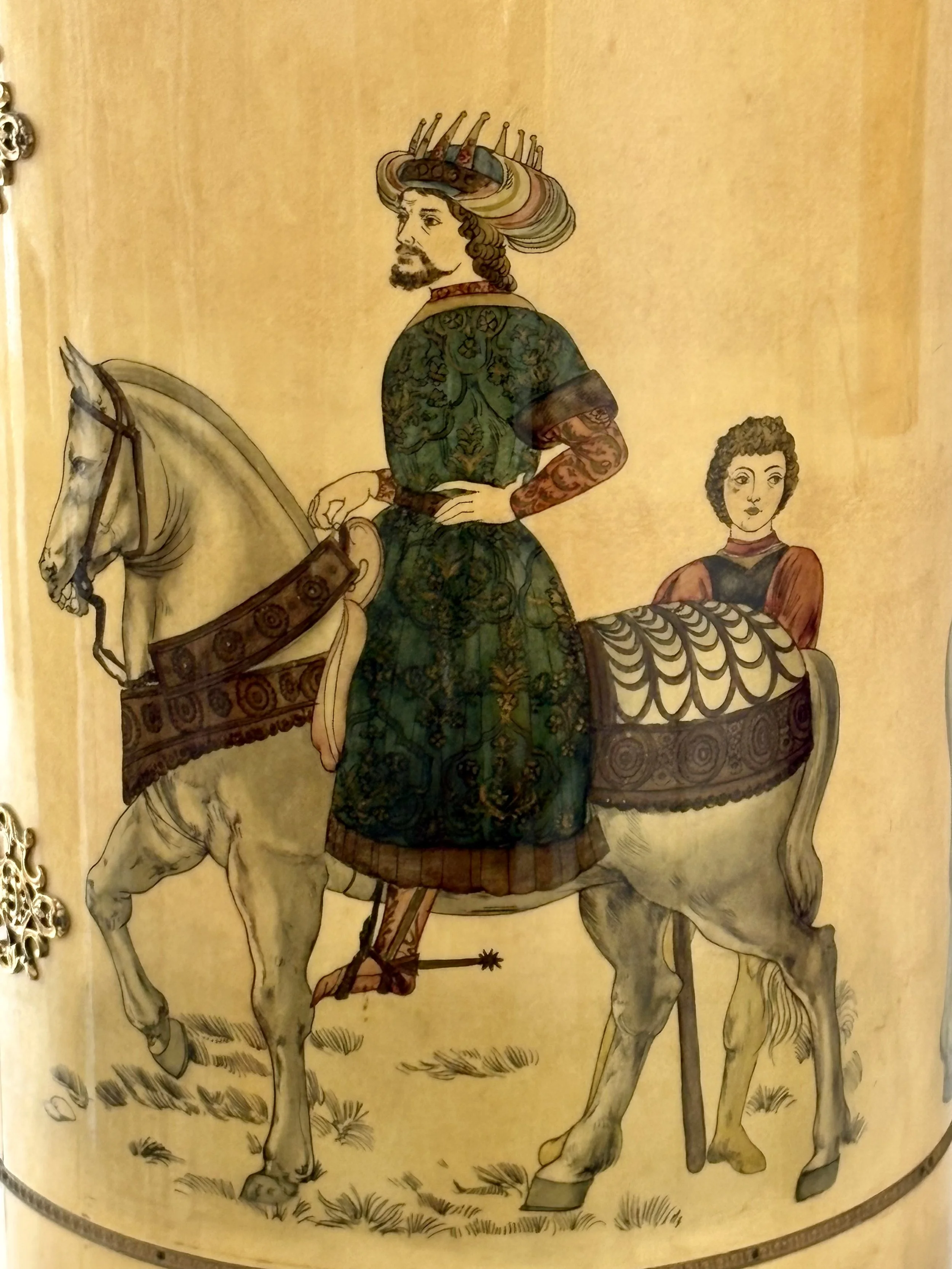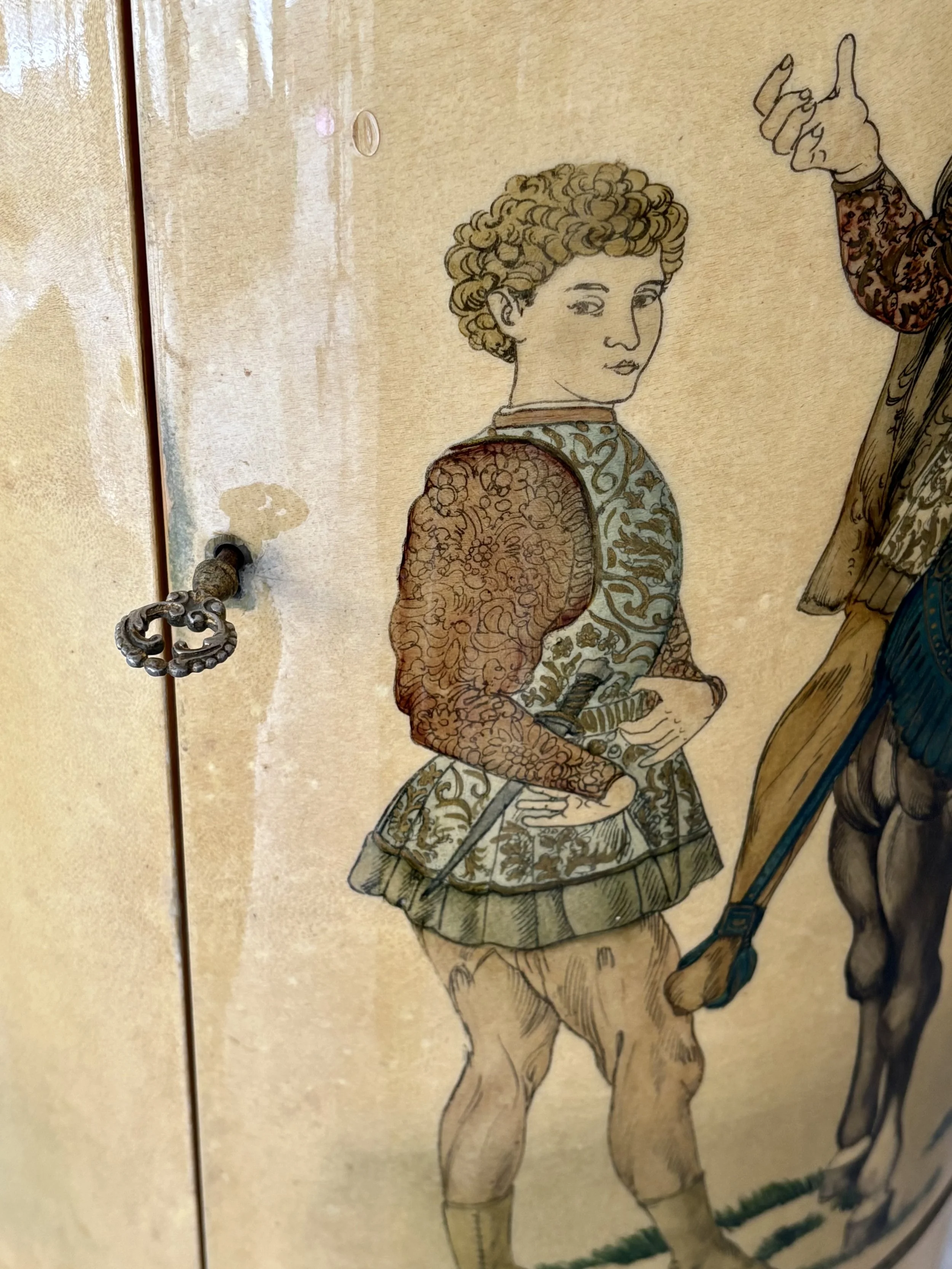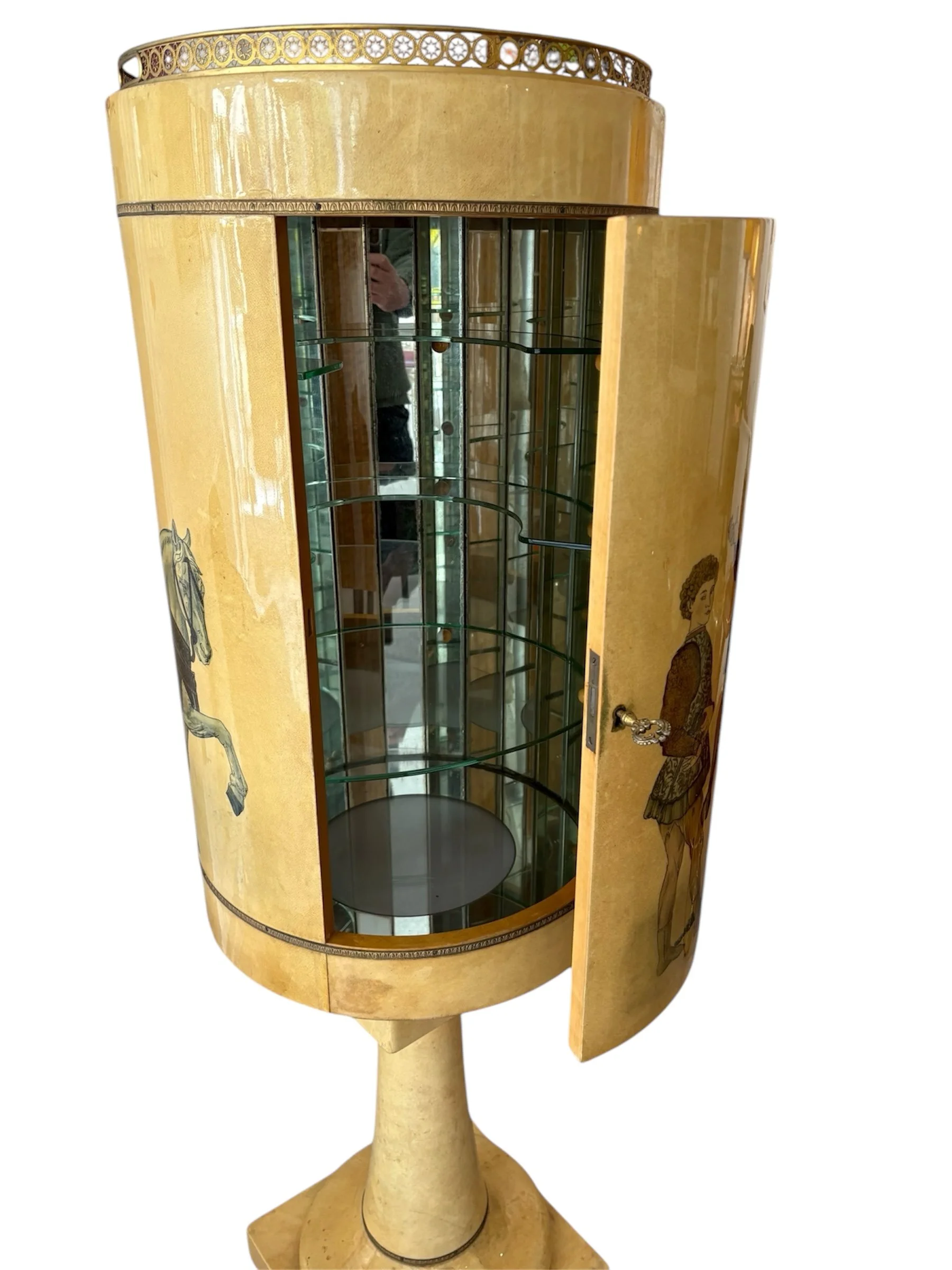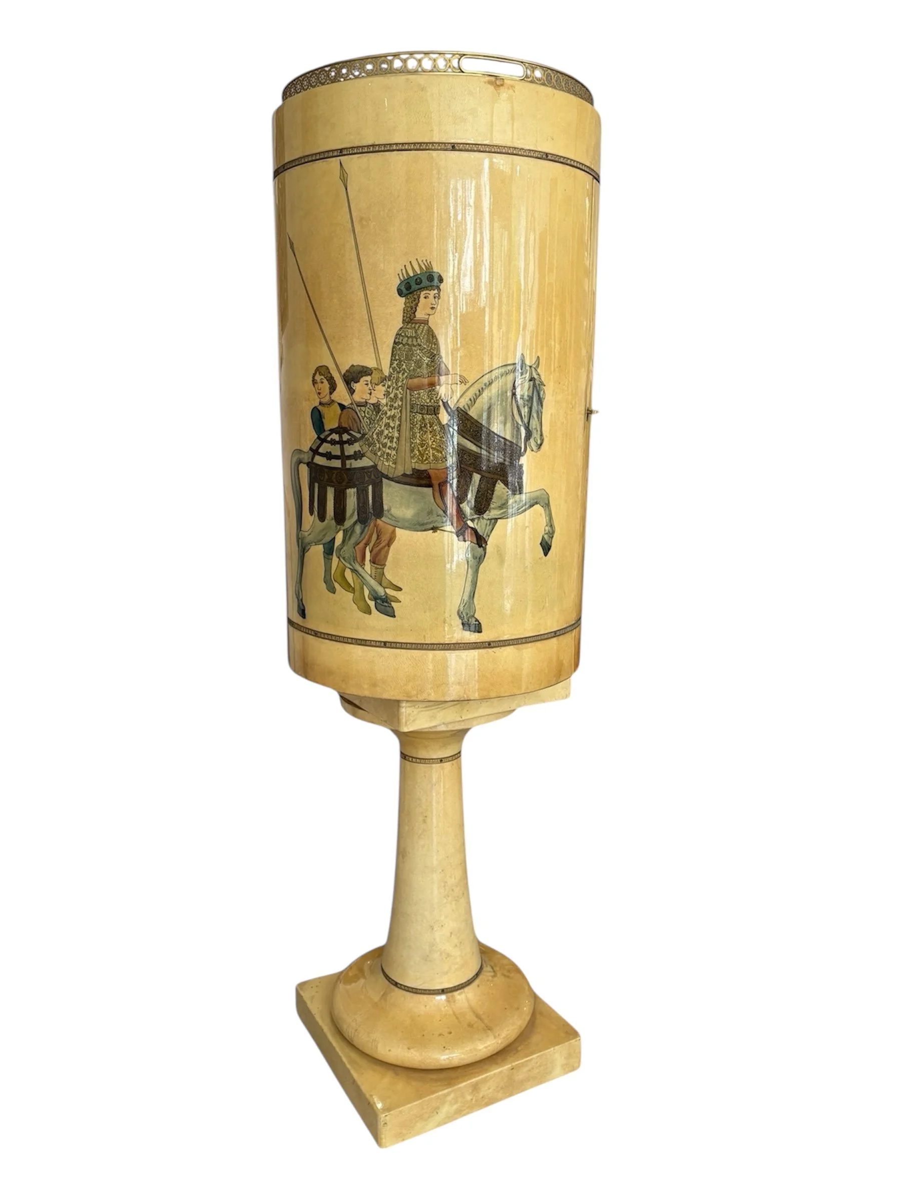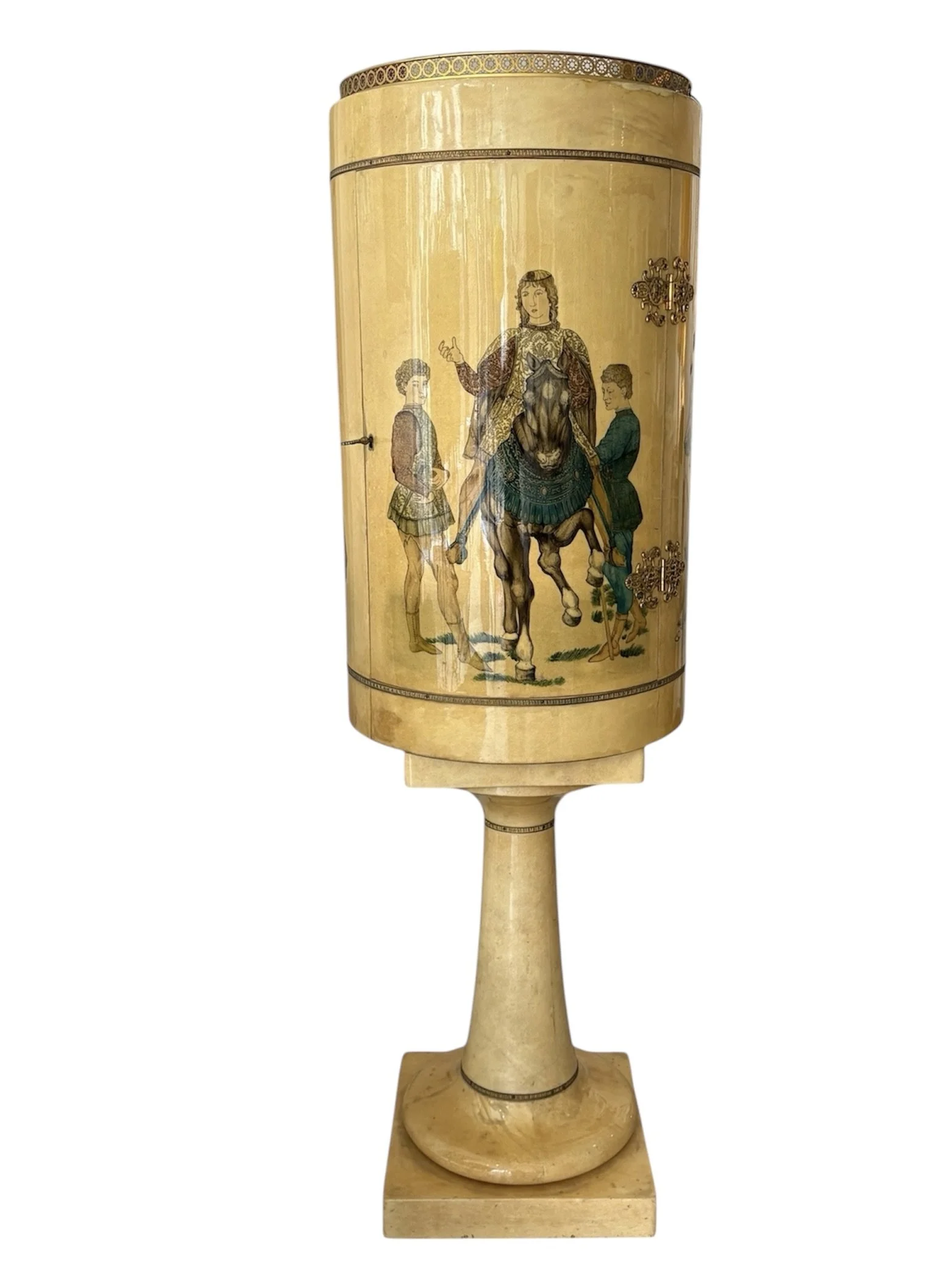 Superb Free standing cylindrical bar designed by Aldo Tura, Italy (1909-1963) C 1955. Decorated in classical Tura style with scenes of medieval knights and kings on horseback . With a removable glass tray on top of superb quality . The piece has an illuminating interior glass and mirrored bar in perfect condition on the inside. The original key is also present . One of Tura's signature pieces made from goatskin which has been hand painted and then lacquered. Tura designed furniture for the high end of the Italian market and like Fornasetti is becoming increasingly collected by design aficionados from across the globe.