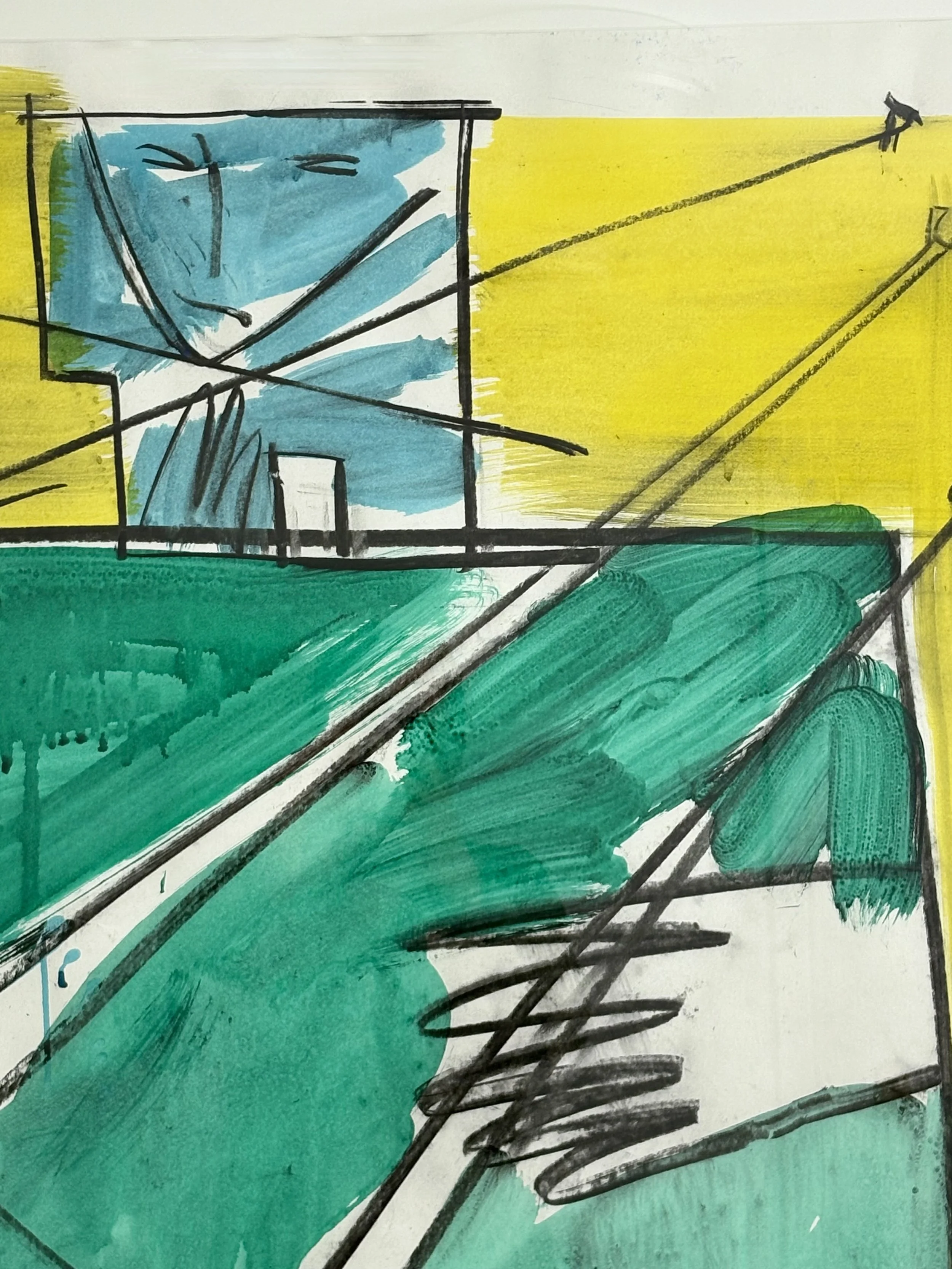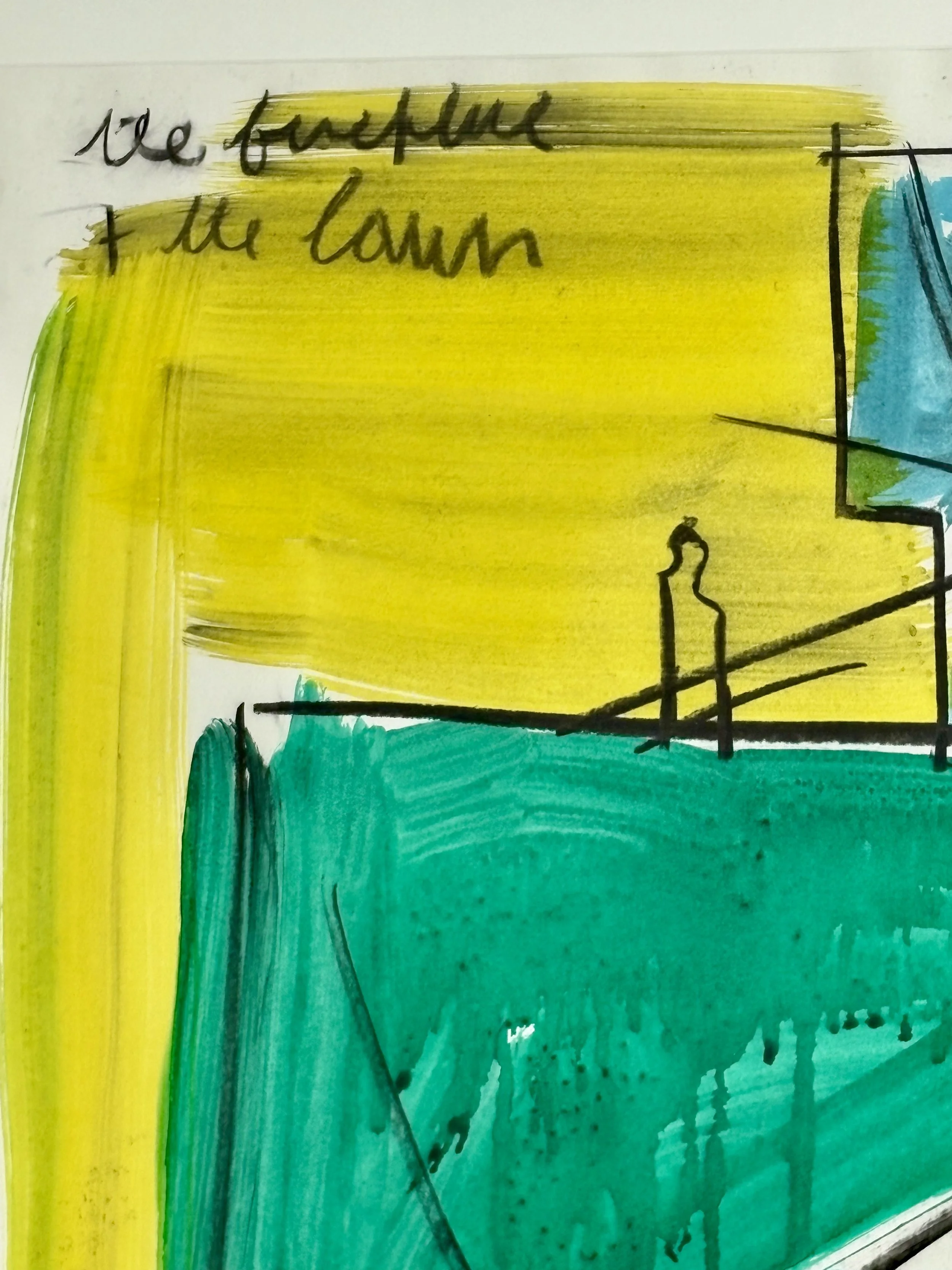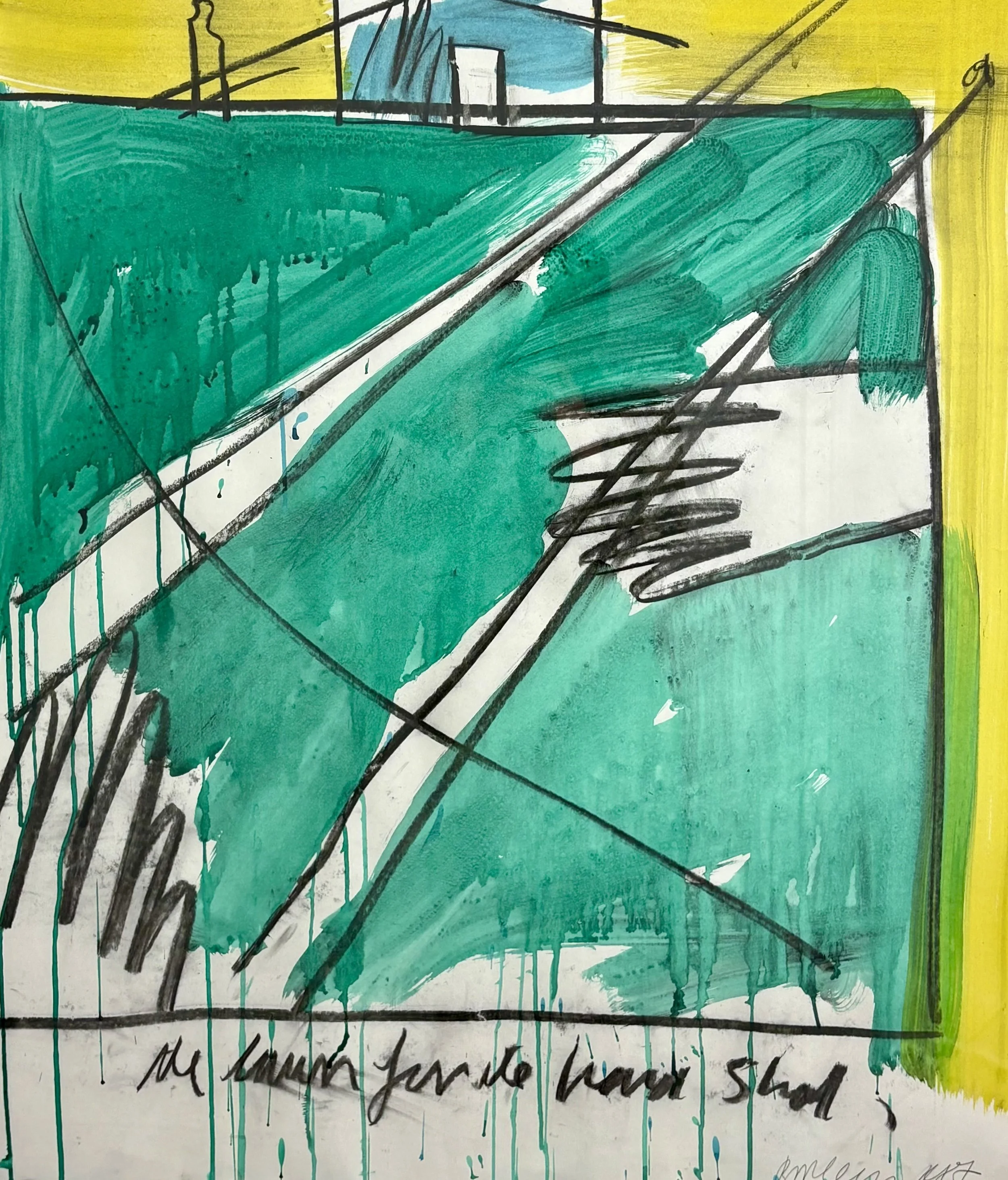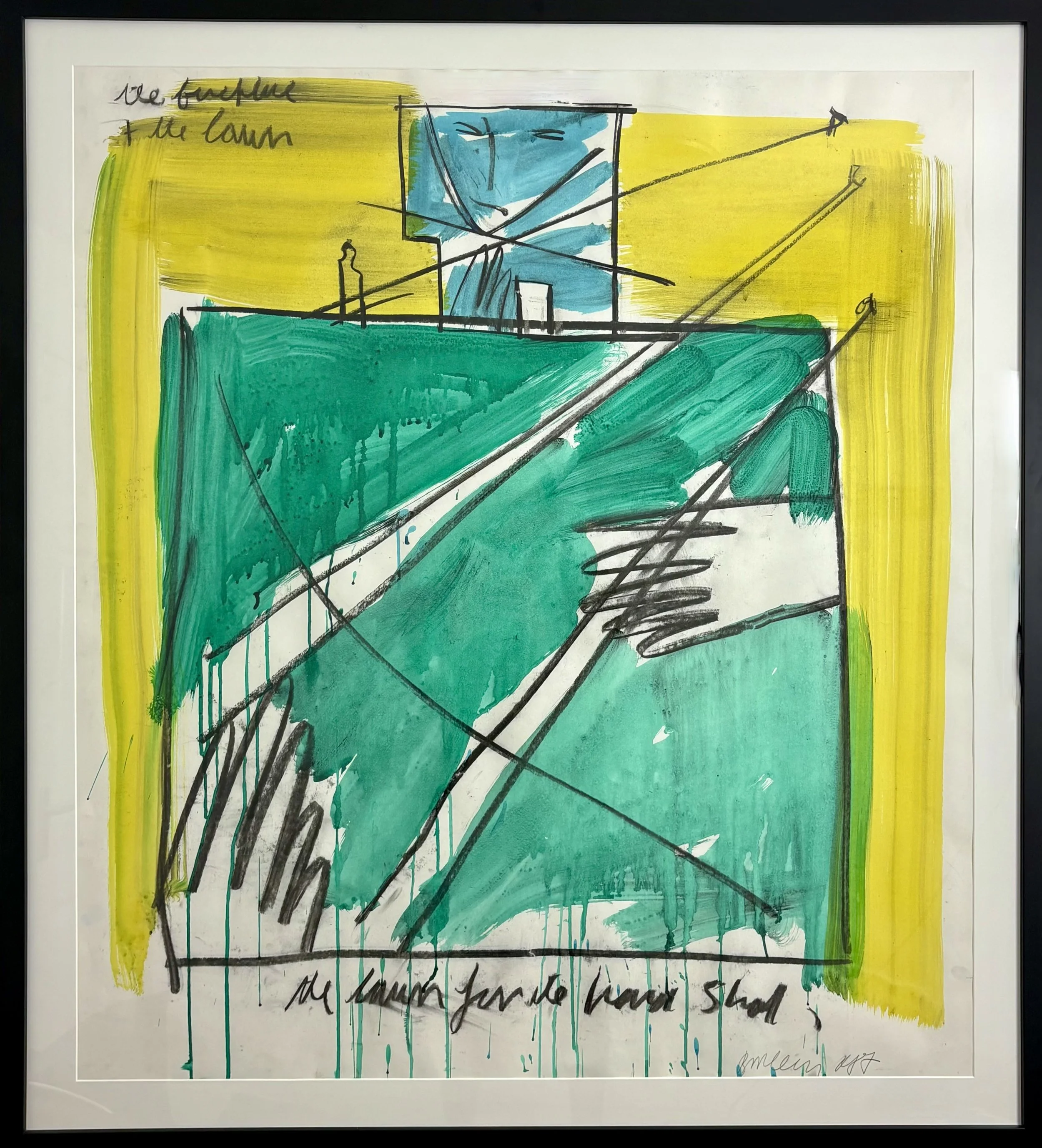 Bruce McLean (British b. 1944) The Fireplace and the Lawn . Gouache , pastel and ink on paper Signed and dated 1987 (lower right), titled (upper left) 111 x 99cm (43½ x 38¾ in.). Frame Size 130 cmx 117cm. Provenance: Galerie Gmyrek, Dusseldorf