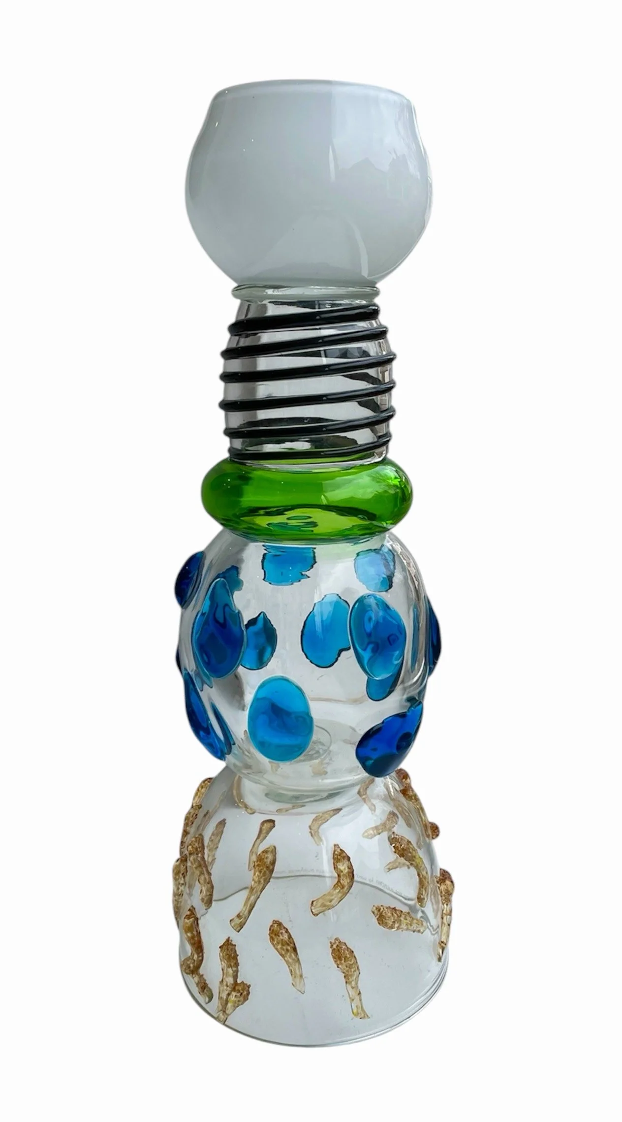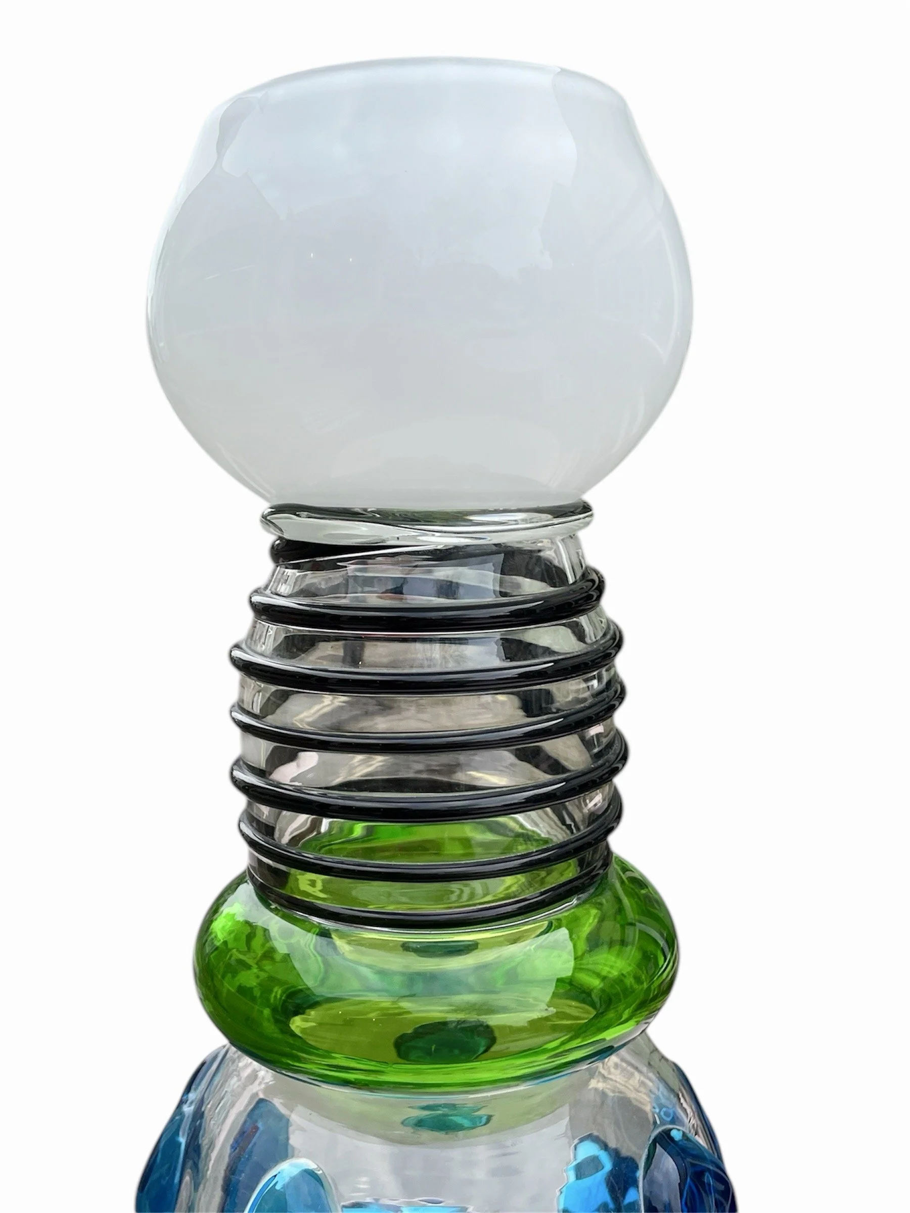 A Memphis Milano Alcor glass vase designed by Ettore Sottsass, made by Compagnia Vetraria Muranese, designed 1983, clear, green and opaque white glass swollen panels, applied with black spiral, blue and golden-brown geometric panels, etched to base rim E Sottsass per Memphis by Compagnia Vetraria Muranese, Provenance: The Tom Watkins collection, Tom Watkins was an avid collector of all things Memphis in the 1980s and early 90s . I met and sold him Memphis lighting from the London Lighting company on the Fulham road in the early 1990s . He was also the former manager of the Pet Shop Boys.50cm high x 17cm wide £2600