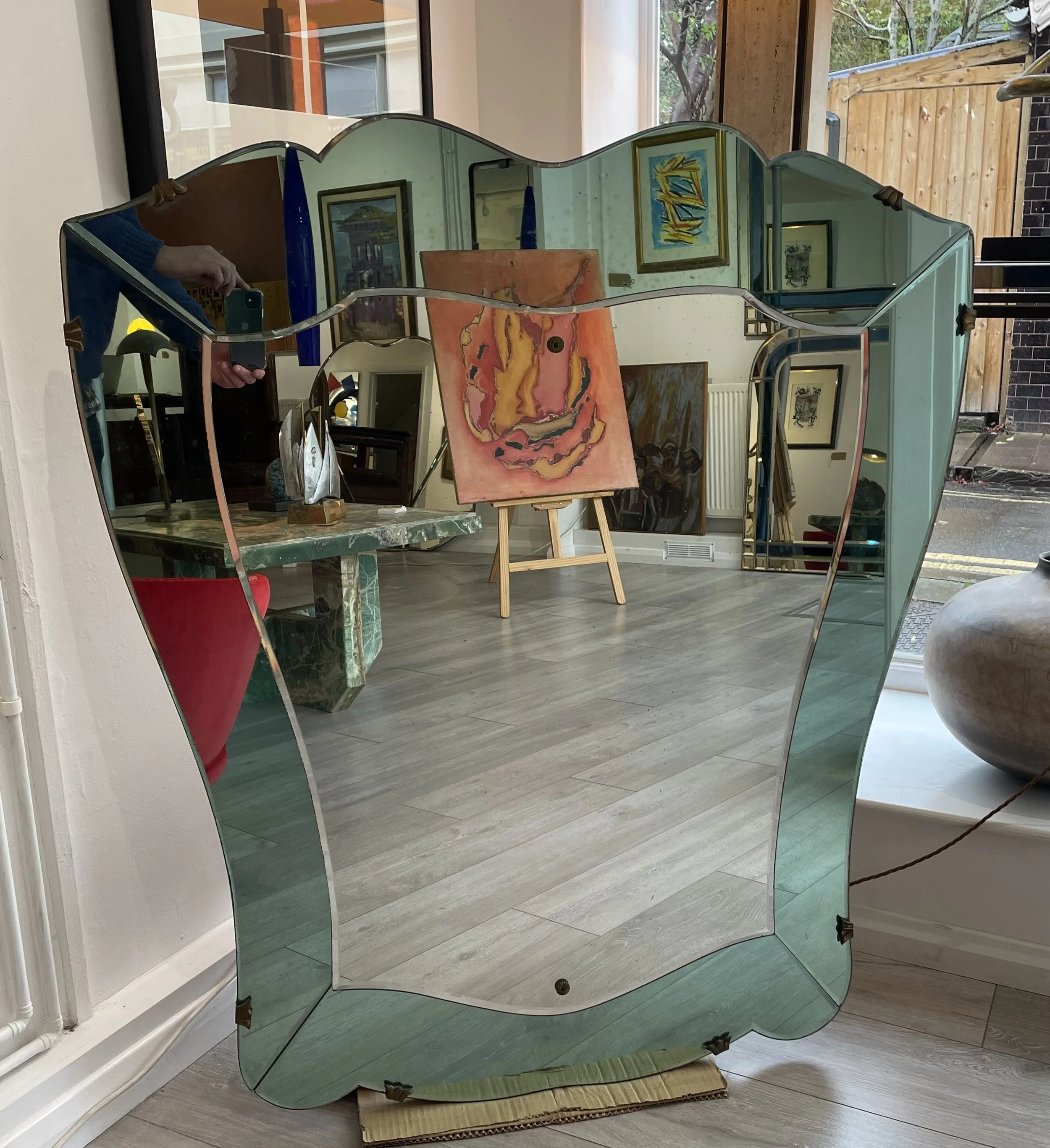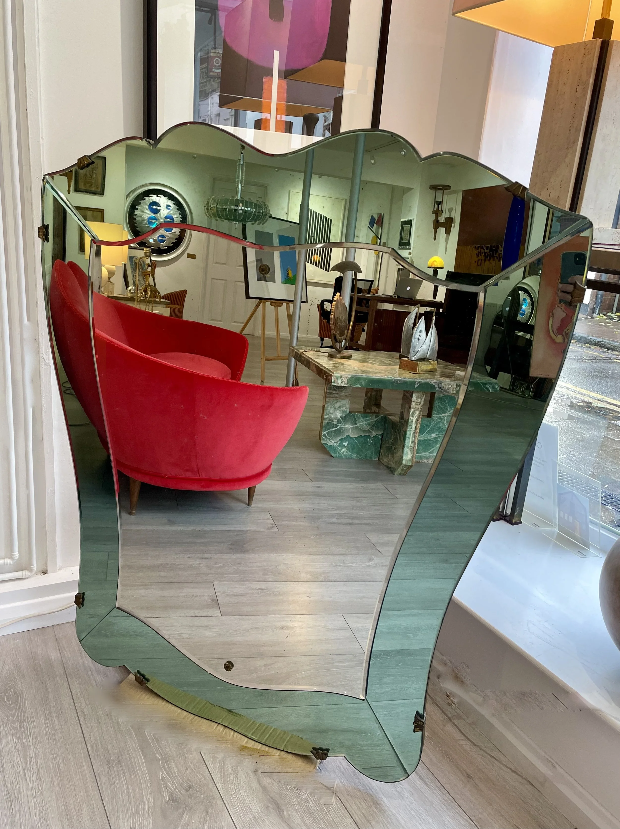 Italian mirror C 1950 with green surround. In the style of Fontana Arte. 115 cm x 100cm £1800