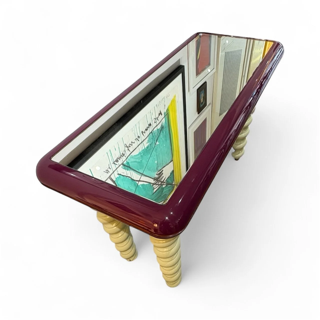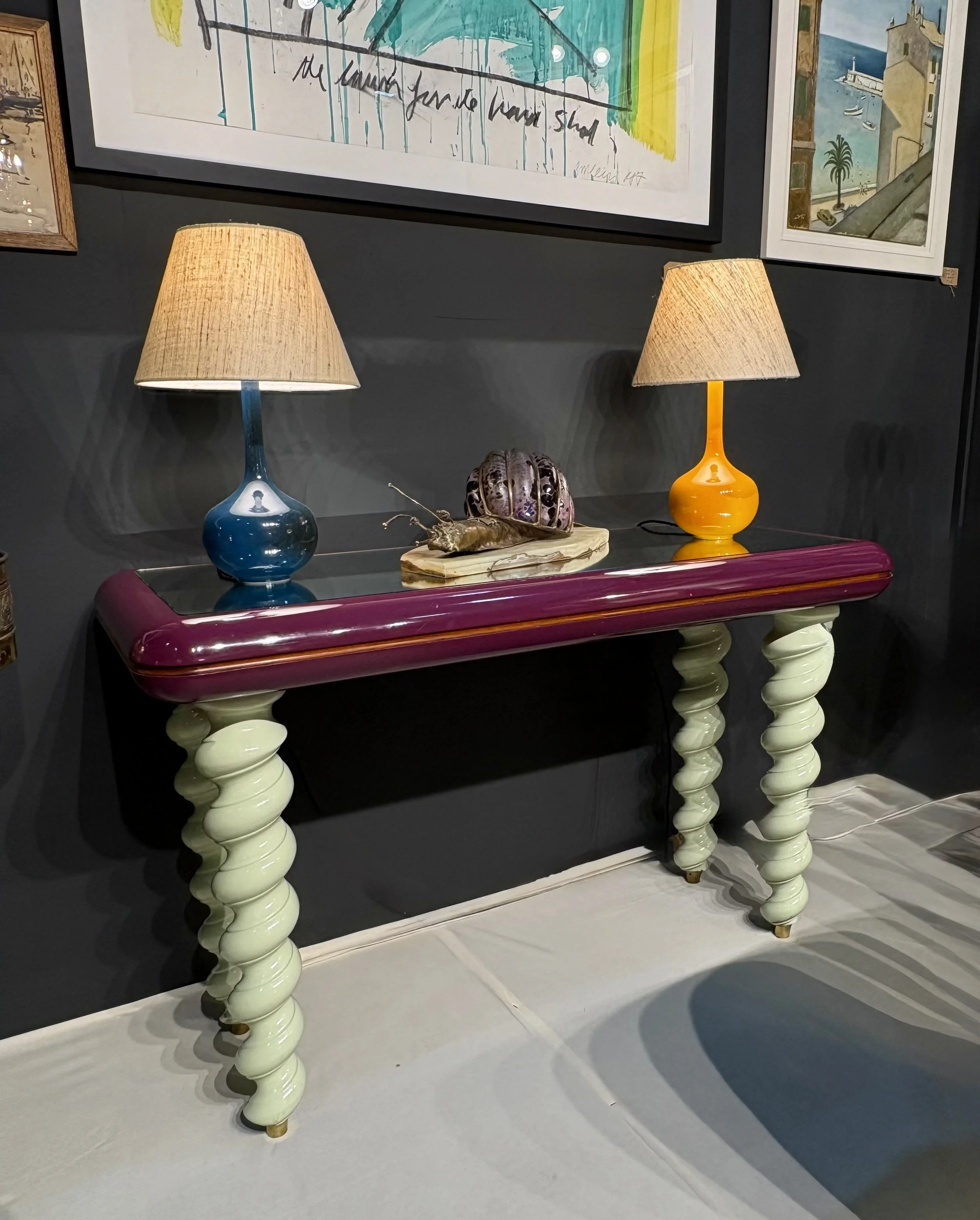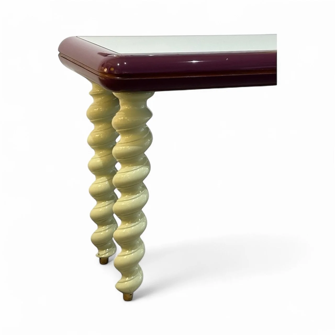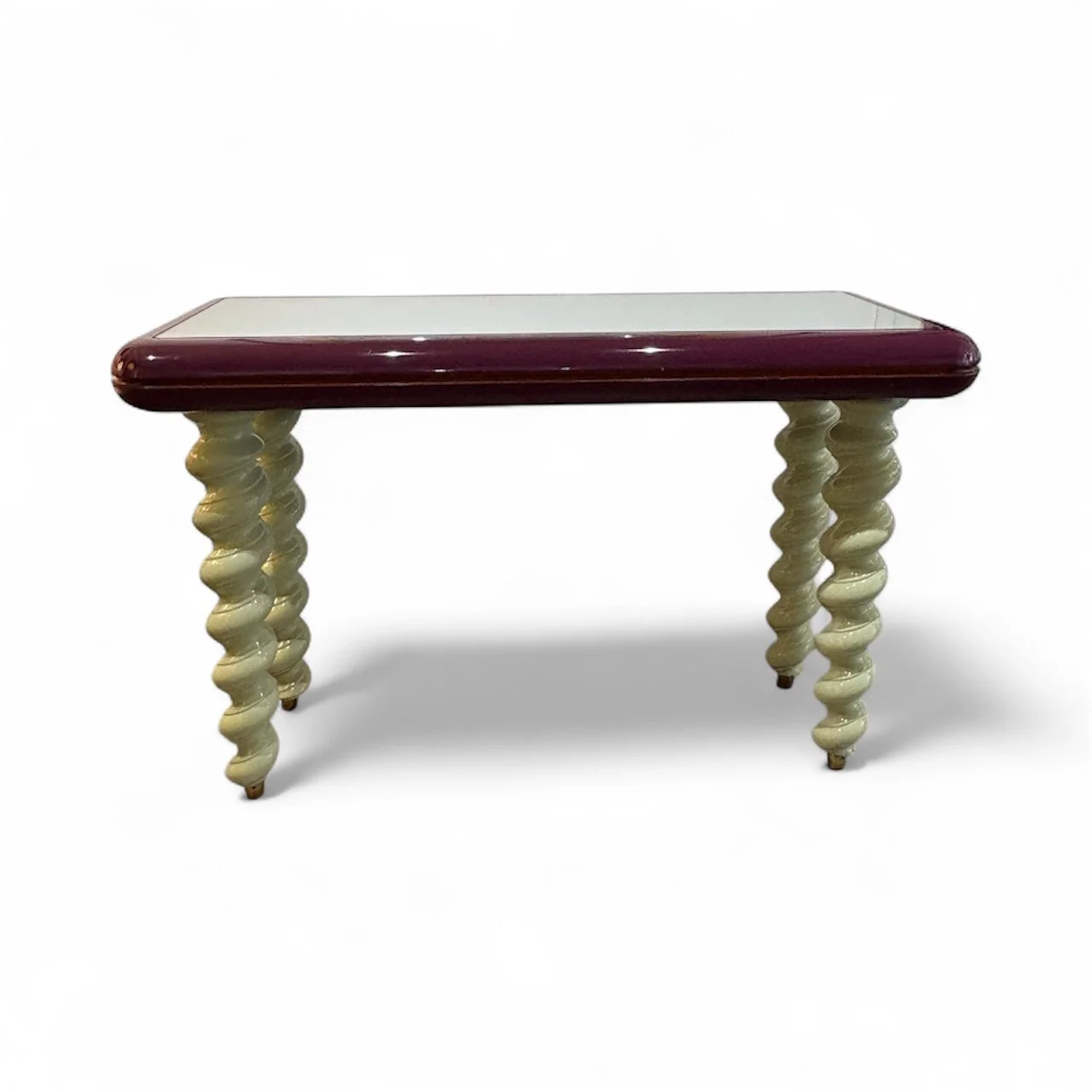 Late 1970s Italian console table. Purchased in France from an Italian dealer who had taken it out of a fashion boutique in Milan . Beautiful quality , made from turned lacquered wood with brass sabot feet and a mirrored glass top. A superb example of good postmodern design in wonderful colours . 124cm wide x 78cm high x 52 deep £2500