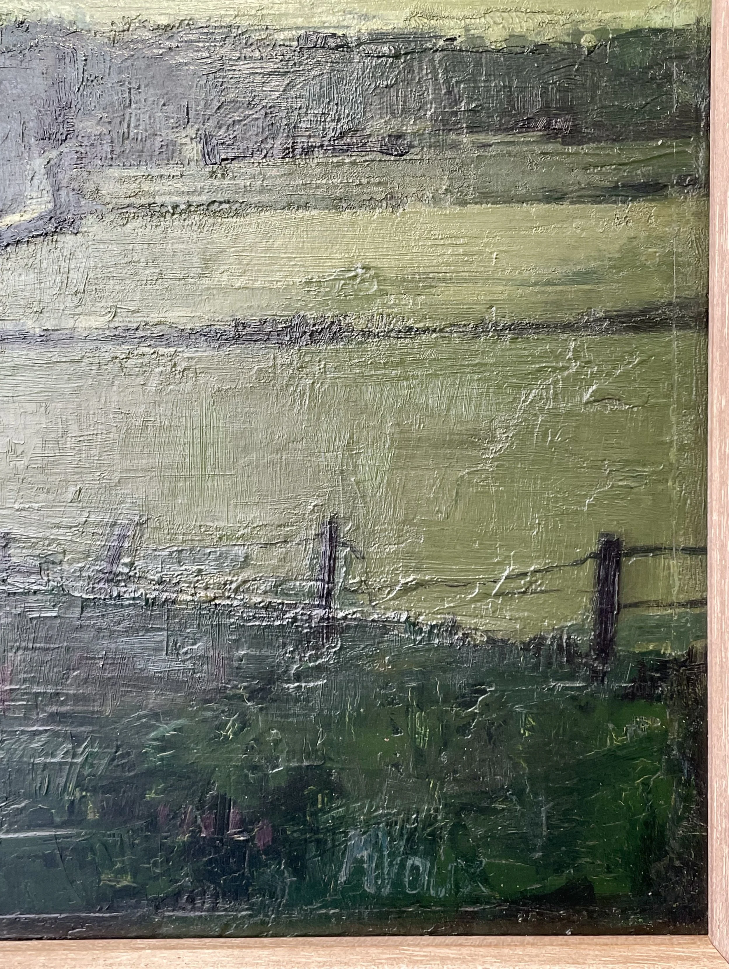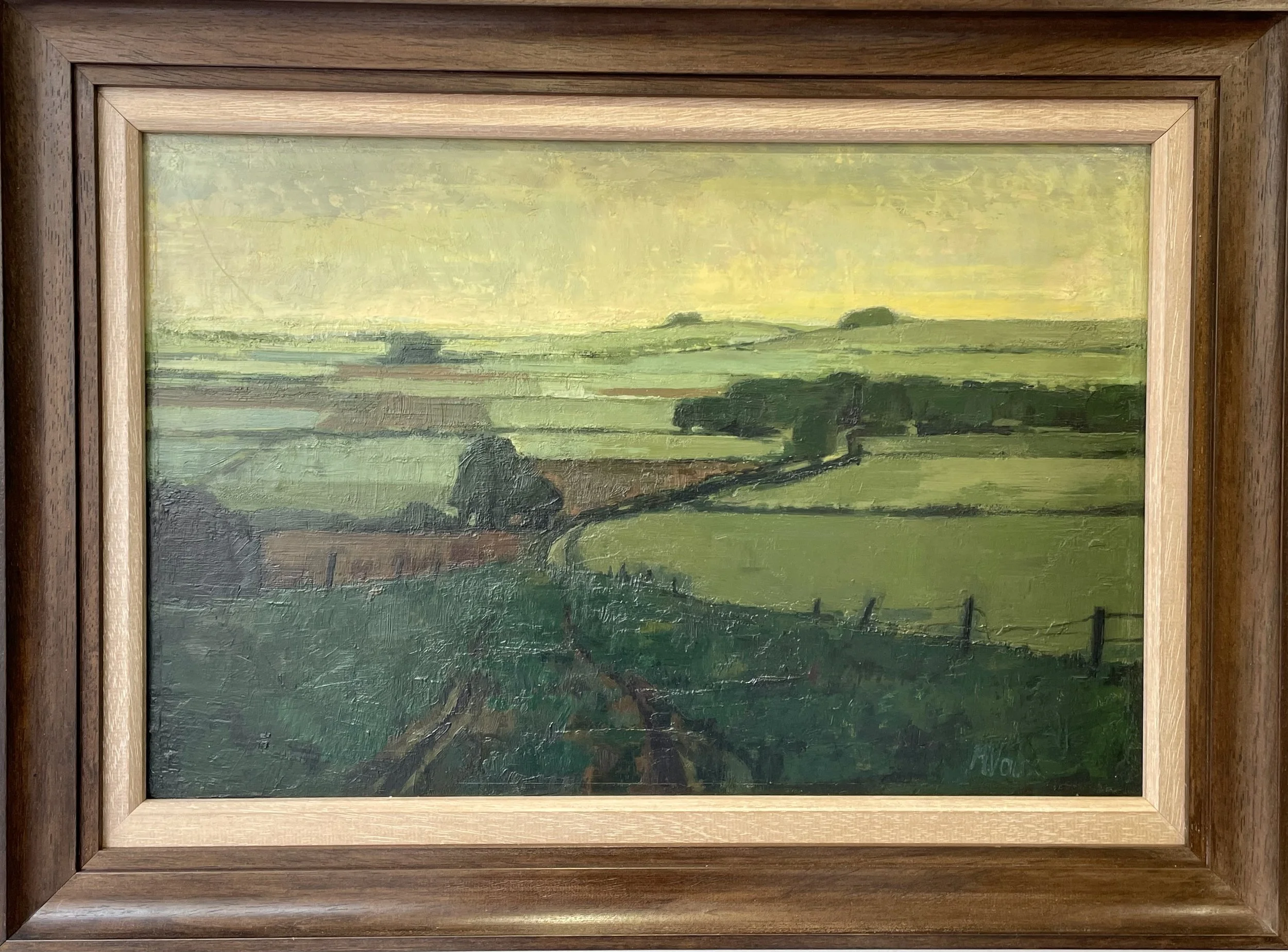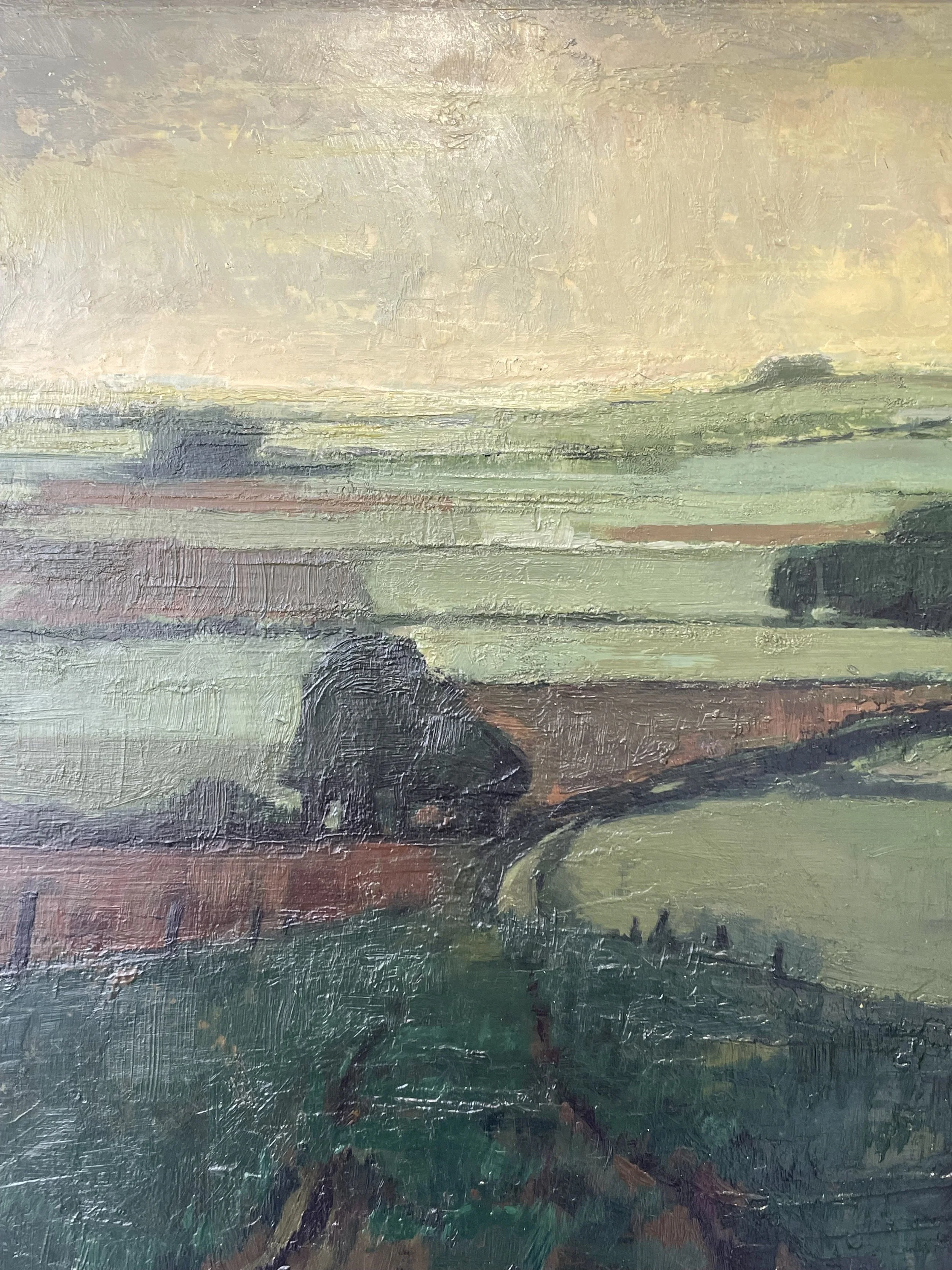 Marc Vaux, British, b 1932. Oil on board , signed and dated 1957 of the Wiltshire Countryside around Swindon. 56cm W x 41cm h (frame) £1600