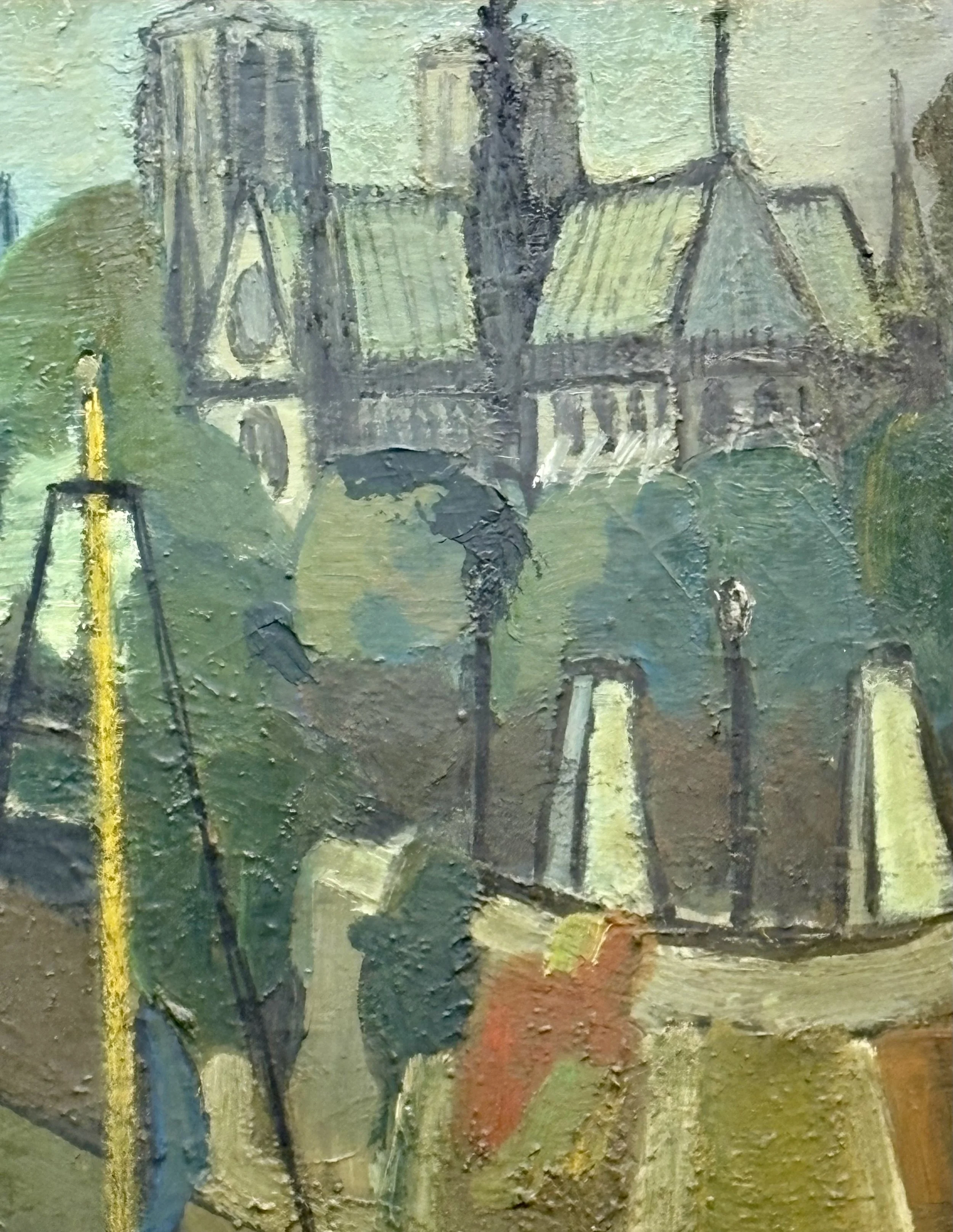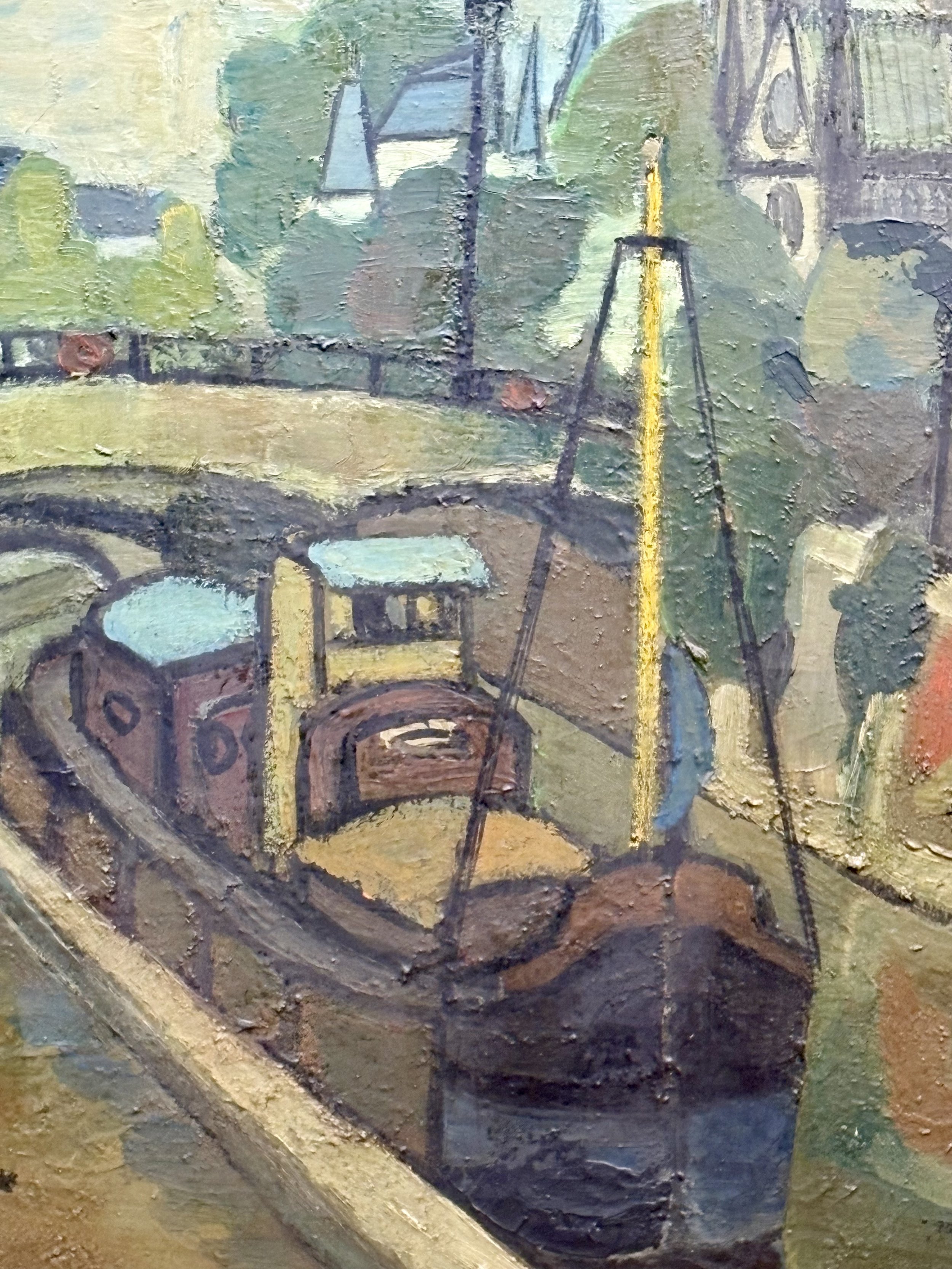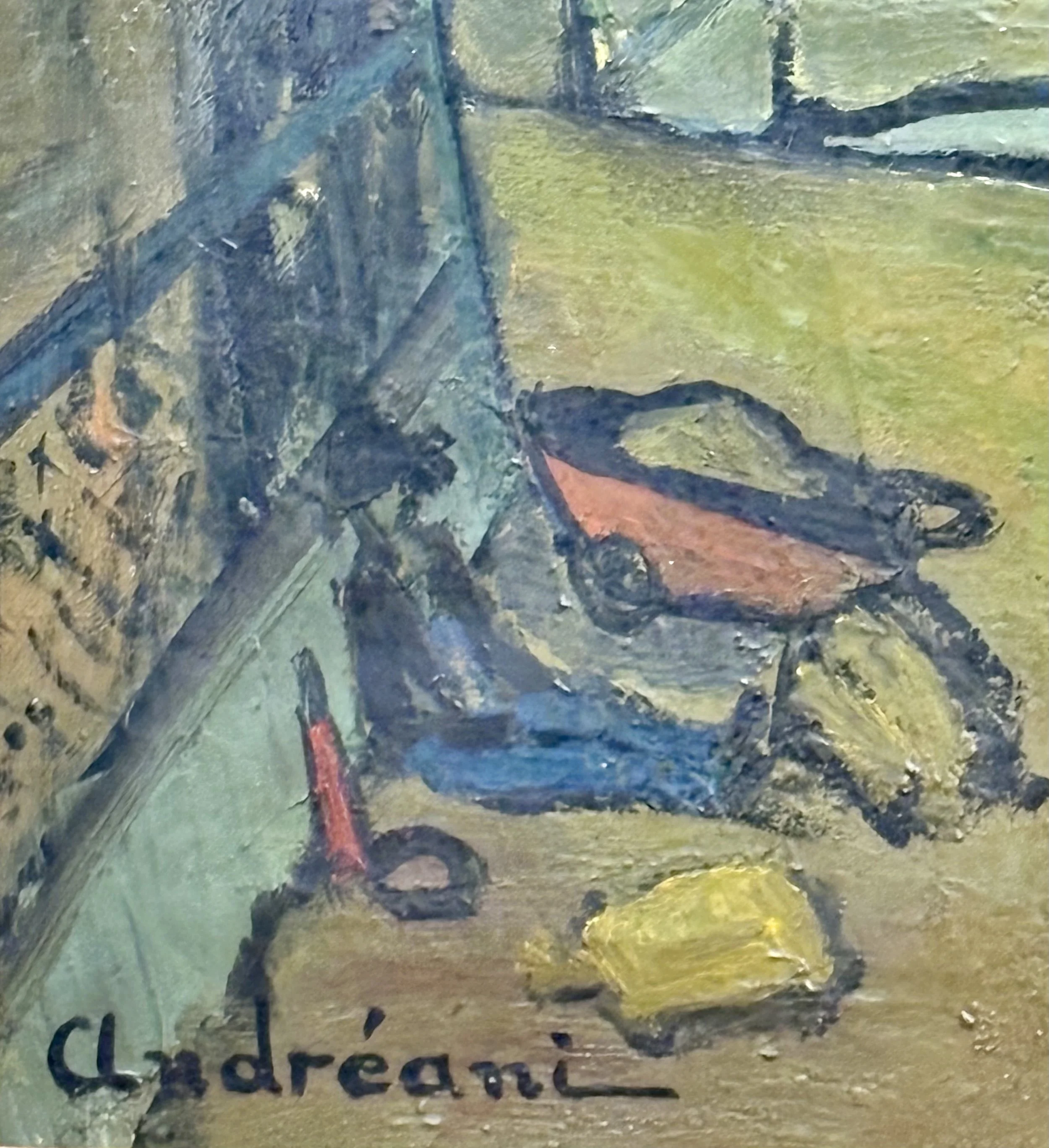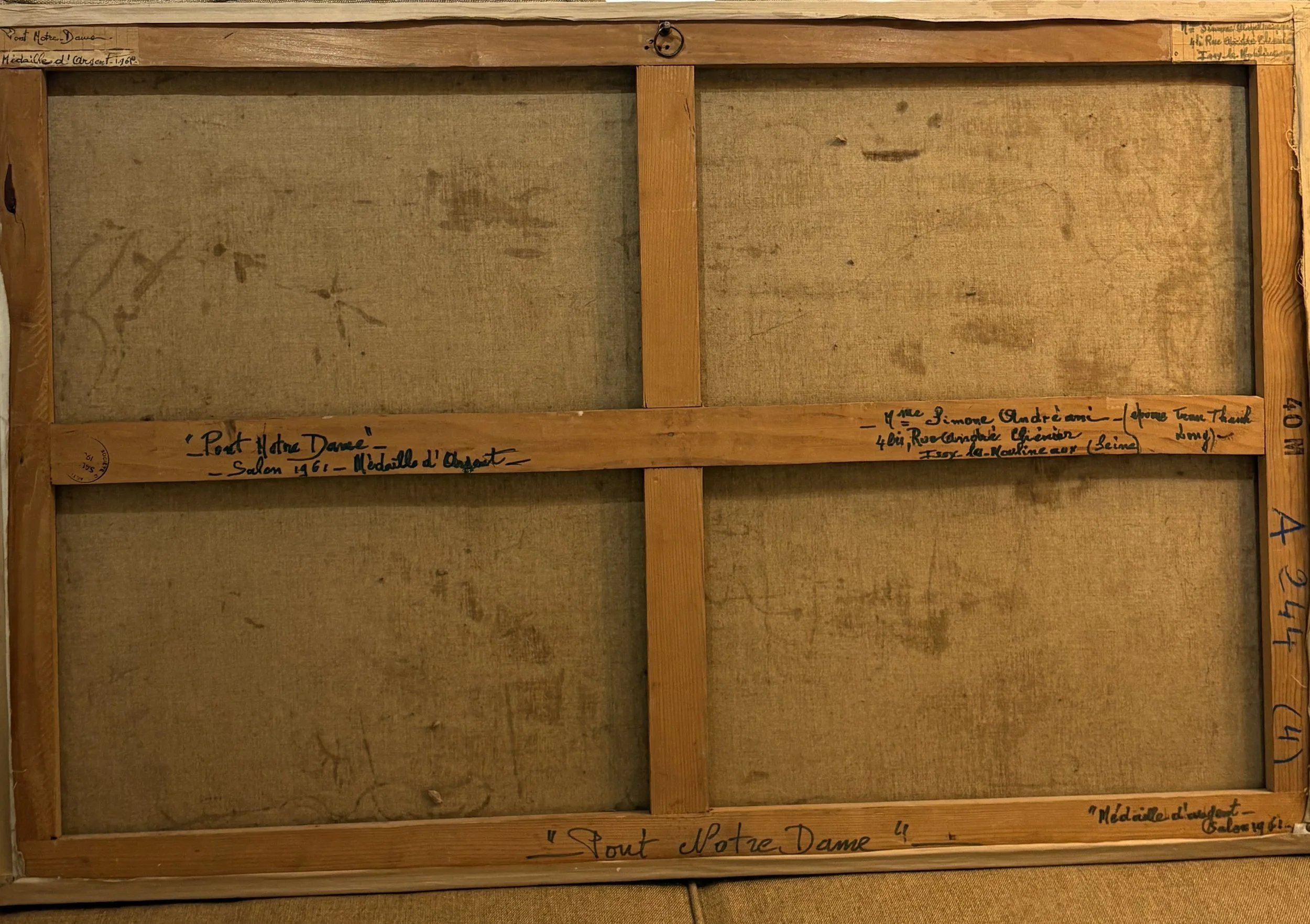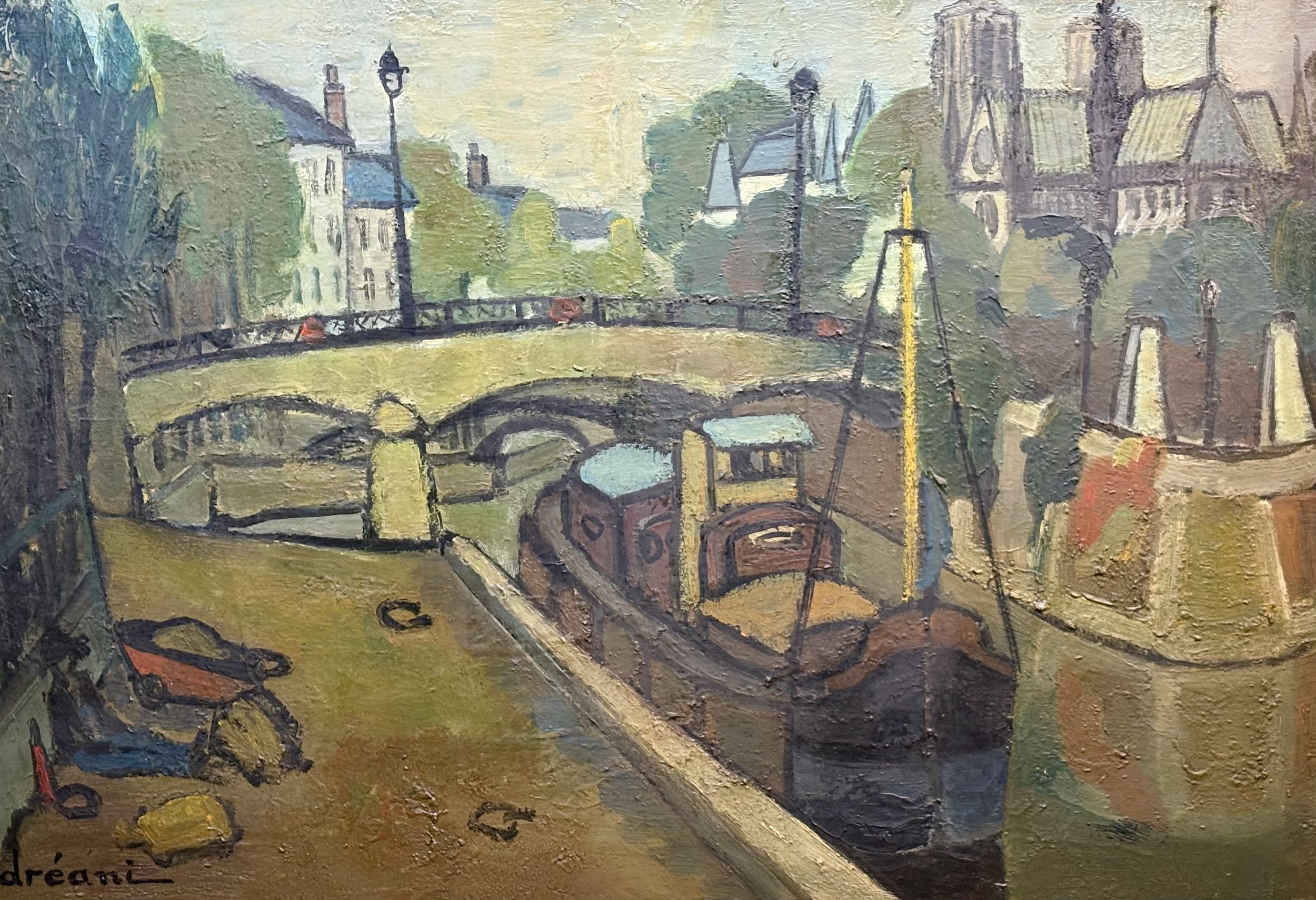Oil on Canvas, 1961 by Simone Andeani 'Pony Notre Dame'This painting won the Silver medal at the Paris Salon in 1961 and depicts a sand barge under the Notre Dame bridge with the Cathedral in the background. Simone was a relatively well know Parisian Artist fro the 1960s